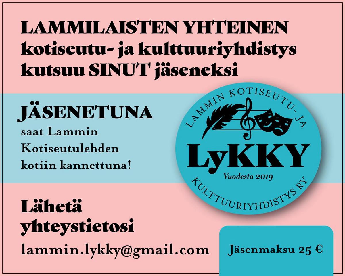 LAMMIN KOTISEUTULEHTI 2025 on lähetetty painolle! Lehteä voi edelleen tilata yllä olevan linkin kautta. Muistathan, että Lykyn jäsenenä saat lehden kotiisi. Jäseneksi voit liittyä yllä olevasta linkistä LIITY JÄSENEKSI.