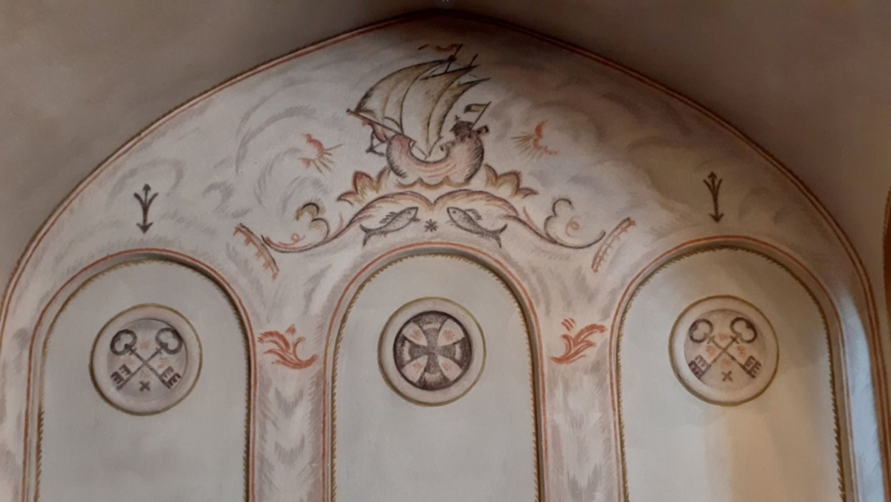 Kirkossa nähtävillä paljon vanhoja symboleja.