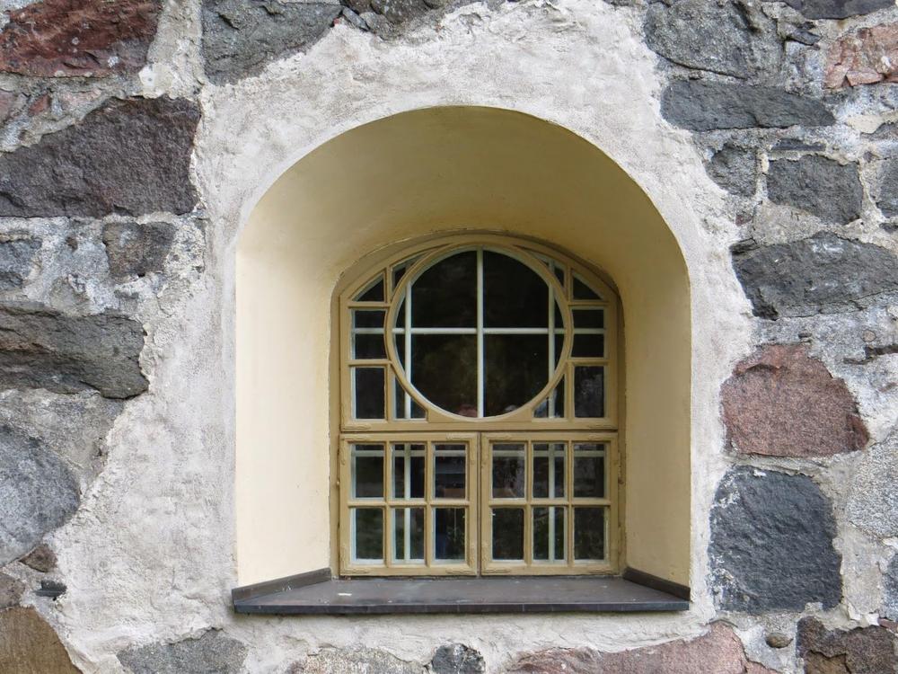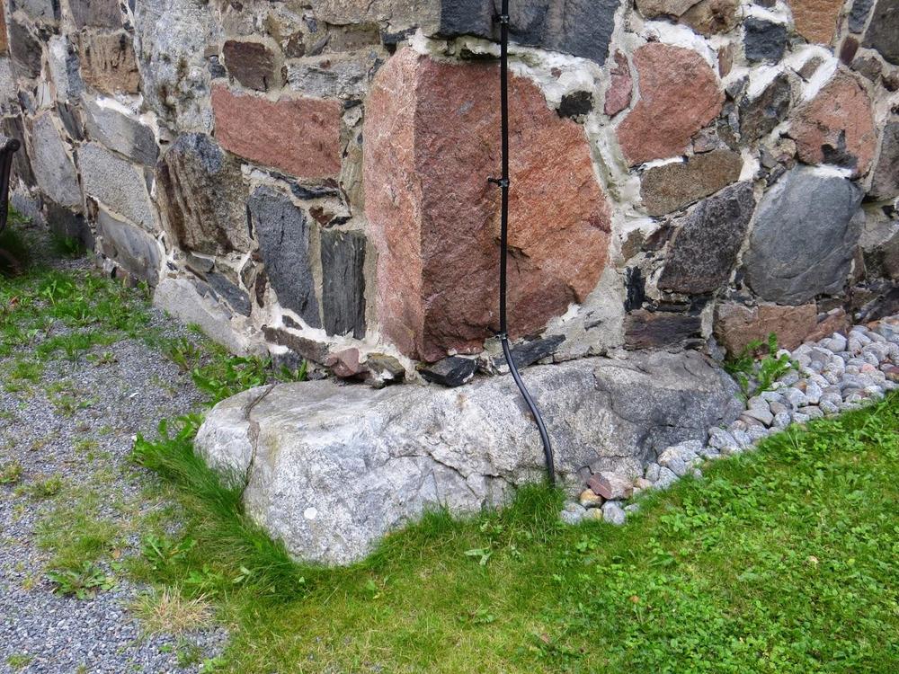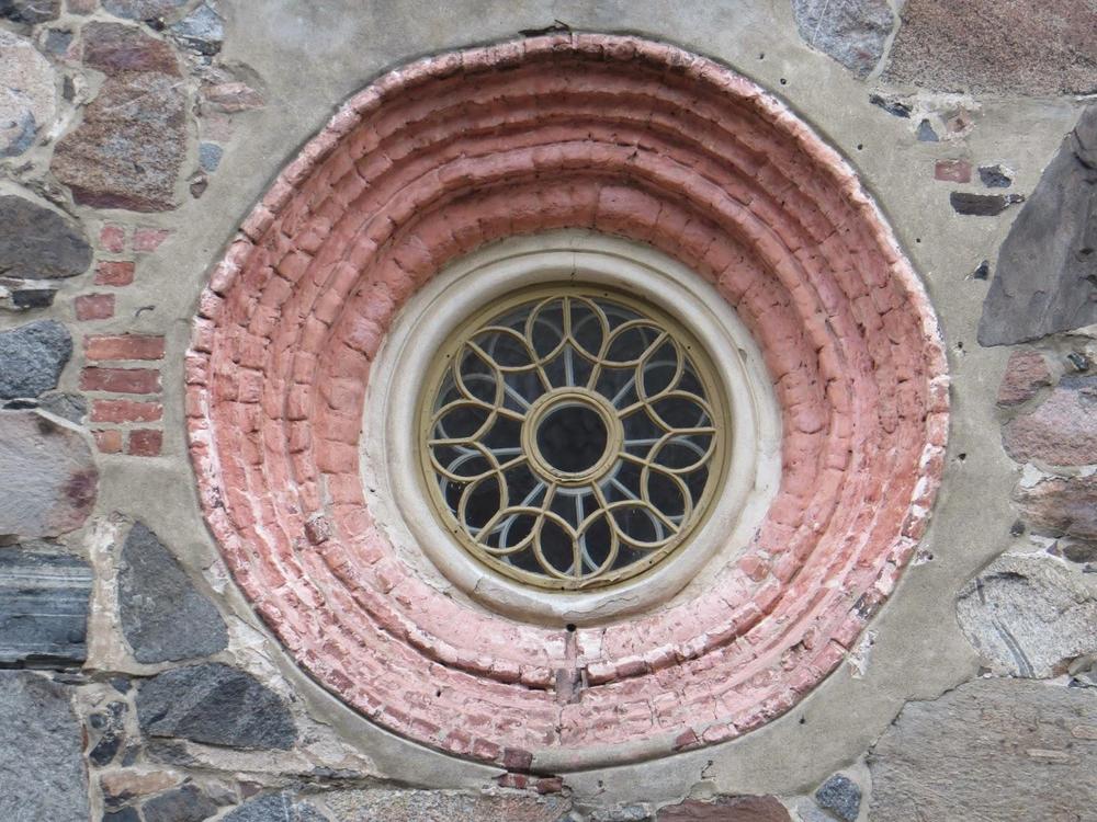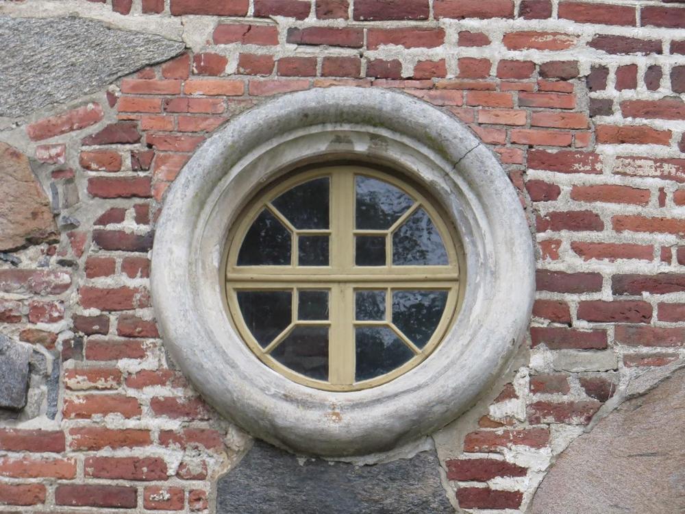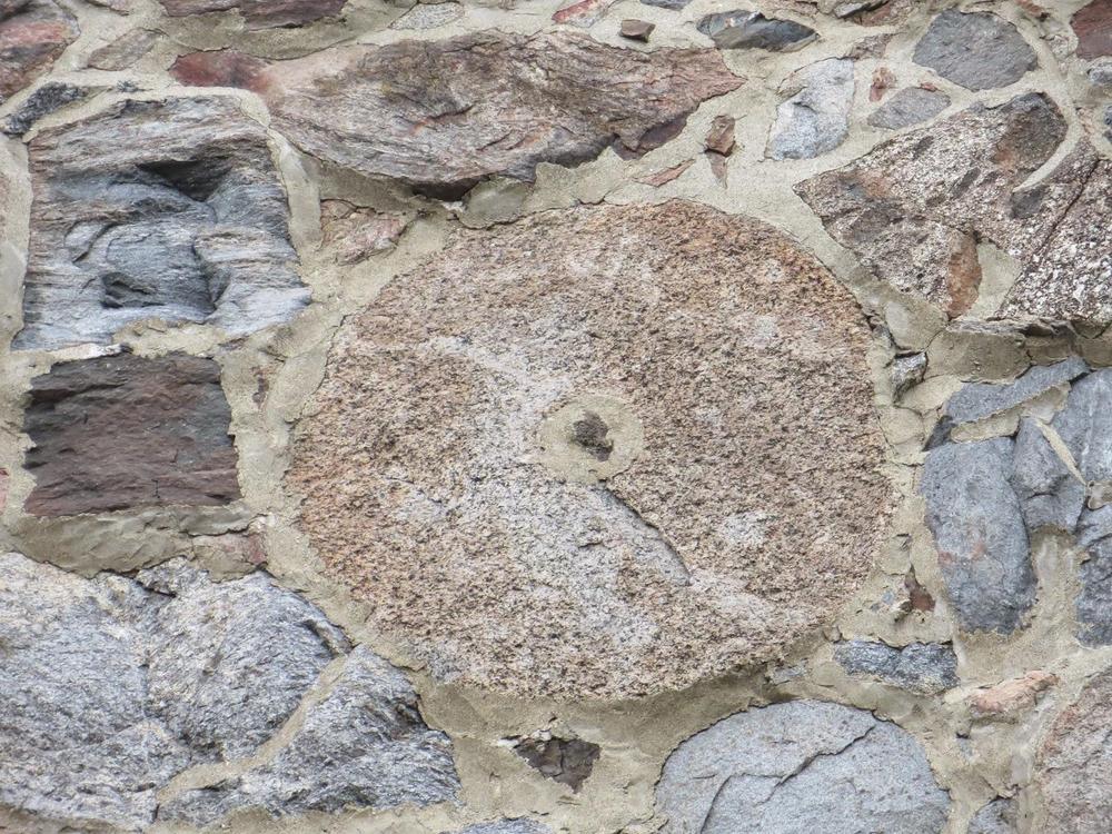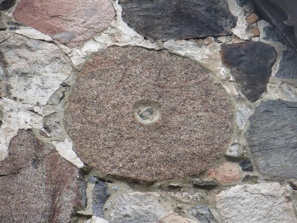There are two millstones in this wall. They are located on the both sides of the middle window.